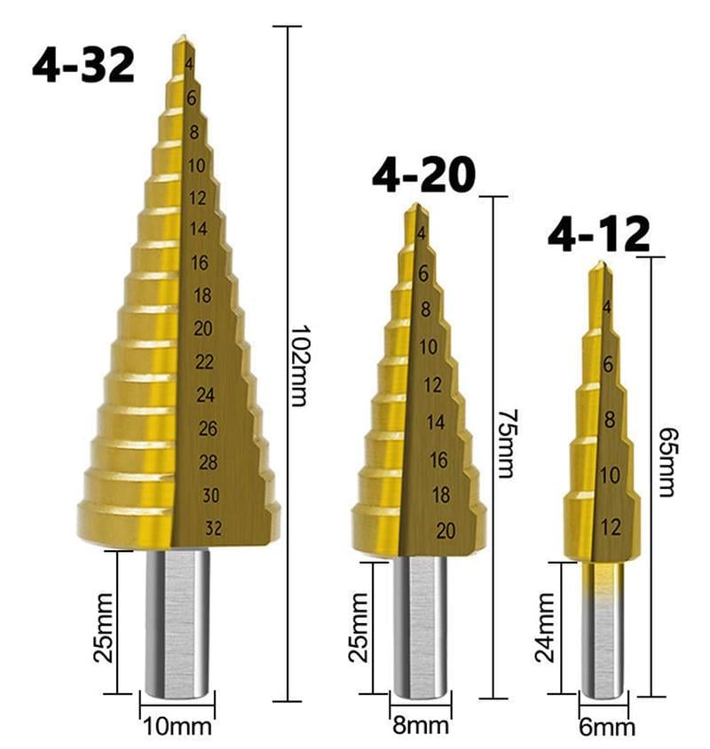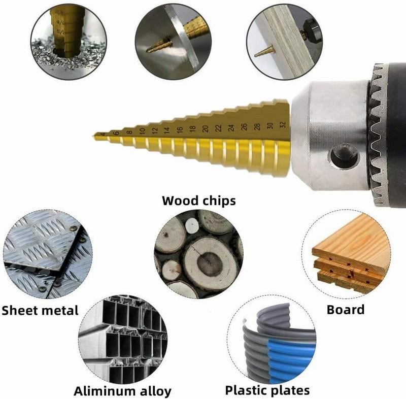 【Package Included】Includes 3 step drill bits: 1 5-step drill from 4mm to 12mm, shank diameter 6mm; 1 9-step drill from 4mm to 20mm, shank diameter 6mm; 1 15-step drill from 4mm to 32mm, shank diameter 6mm. 3 Serrated Bits, Diameter: 3mm, 6mm, 8mm.