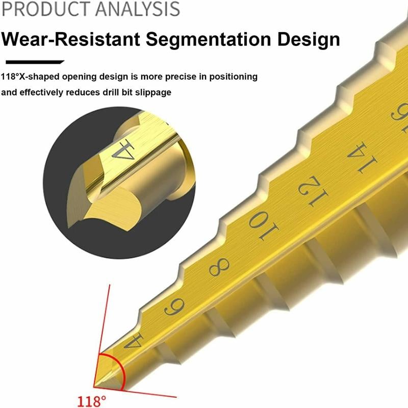 【High Quality】These drill bits are made of high-speed steel with titanium-plated surface, this step drill set is heat-resistant, wear-resistant, anti-oxidation, non-rusting, and has a long service life.